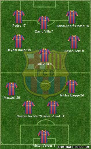 valdes · samuel · puyol · alves · abidal · mascherano · xavi · iniesta · pedro · messi · villa