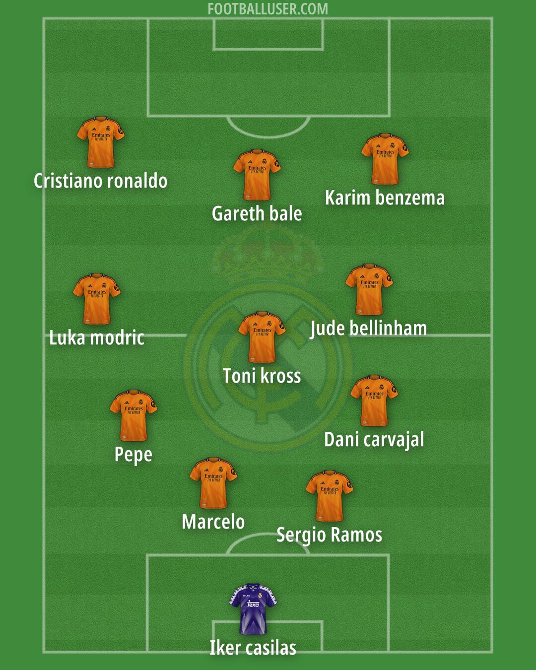 F. Puskás (K. Benzema) · C. Ronaldo (V. Júnior) · L. Figo (G. Bale) · C. Makélélé (Casemiro) · C. Seedorf (T. Kroos) · K. Mbappé (Zico) · Marcelo (F. Mendy) · F. Rijkaard · F. Cannavaro · T. A. Arnold (F. Valverde) · T. Courtois