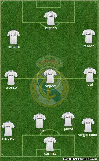 Casillas · Albiol · Carvalho · Arbeloa · Ramos · Alonso · Kaka · Ronaldo · Ozil · Higuain · Adebayor