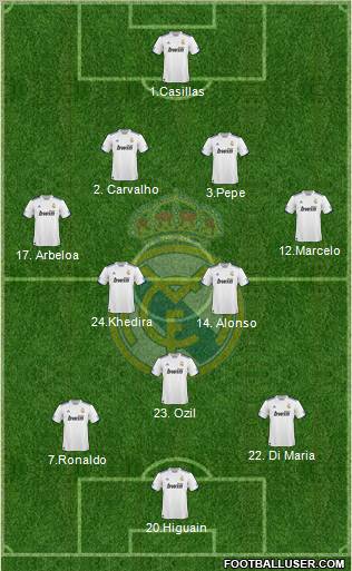 Casillas · Pepe · Carvalho · Marcelo · Ramos · Xabi Alonso · Khedira · KaKa · Ozil · Cristiano Ronaldo · Benzema