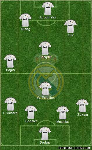 Casillas 1 · Sergio Ramos 4 · Chivu 6 · Glen Johnson 13 · Marcelo 12 · Gago 5 · Özil 23 · Di Maria 22 · Ronaldo 7 · Lukaku 11 · Rooney 10