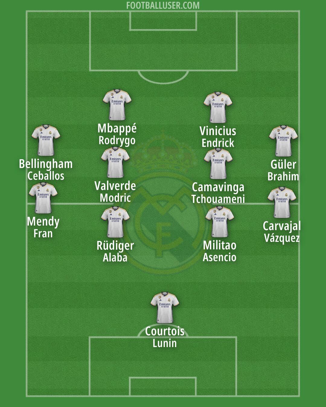 T. Courtois (4560 min) · L. Vazquez (3350 min) · R. Asencio (3118 min) · A. Rudiger (4270 min) · F. Garcia (3230 min) · A. Tchouameni (4601 min) · F. Valverde (5286 min) · J. Bellingham (4573 min) · Rodrygo (3448 min) · Vinicius Jr (4409 min) · K. Mbappe' (4610 min)