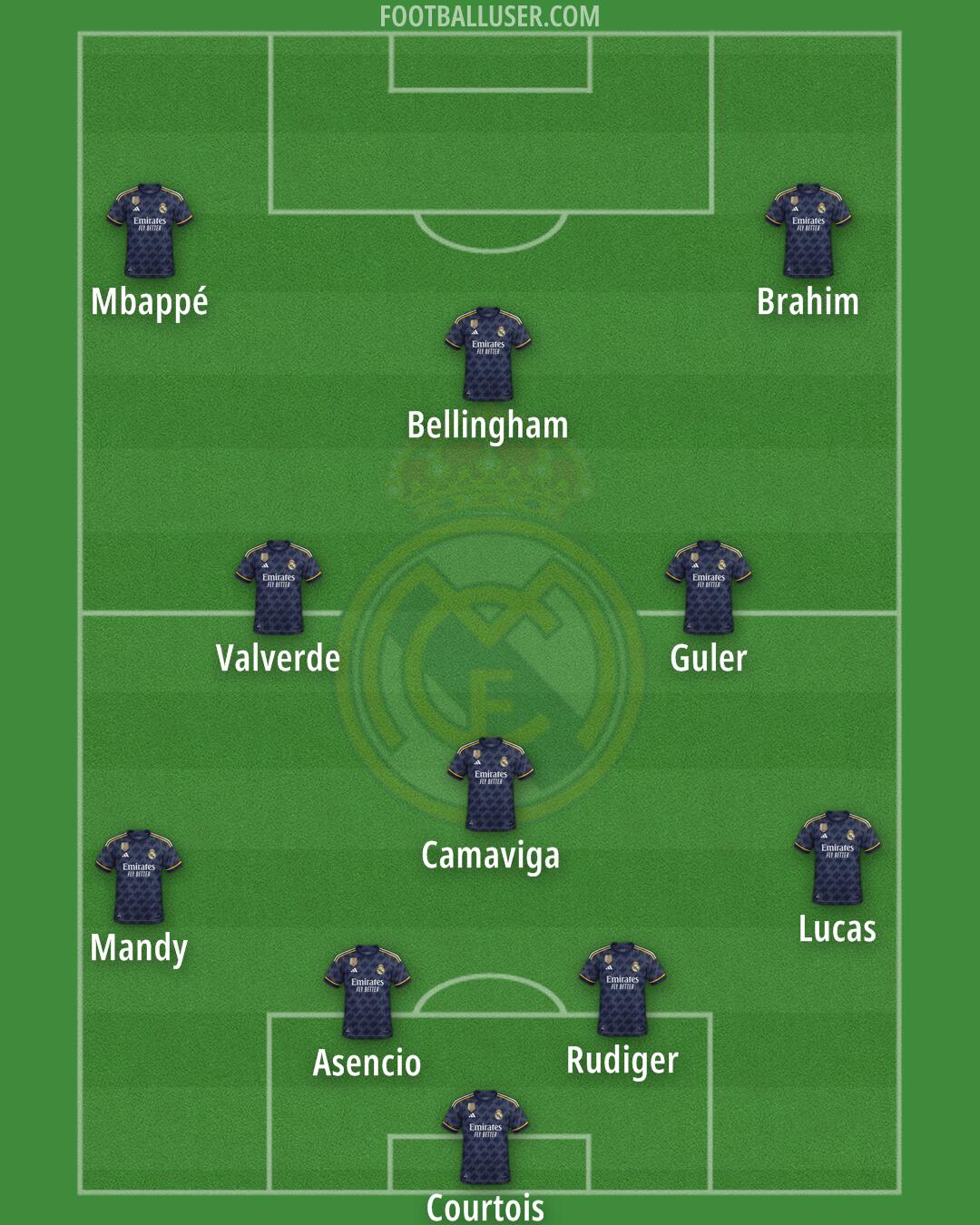 Courtois (Lunin) · Tchouameni (Camavinga) · Huijsen (Alaba/Jacobo) · Rudiger (Asencio/Militao) · FICHAJE (Fran García) · Trent (Carvajal/Fortea) · Bellingham (Mastantuono) · Valverde (Nico paz) · Guler (Ceballos) · Vini Jr (Brahim) · Mbappe (Endrick/ Gonzalo)