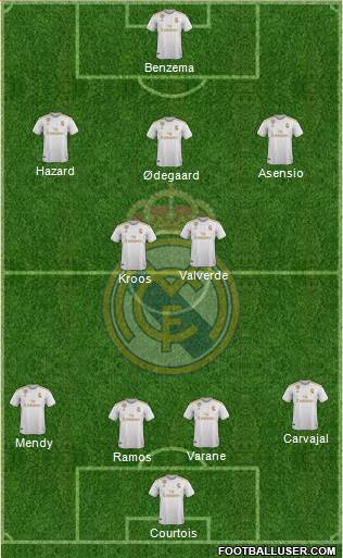 Lunin · Courtois · Nacho · Vallejo · A.Rüdiger · E.Militão · Mendy · Vázquez · D.Alaba · Carvajal · Tchouaméni · Camavinga · Casemiro · Toni Kroos · Hazard · Valverde · ??? · Luka Modrić · Rodrygo · Benzema · Vinícius Jr · ???