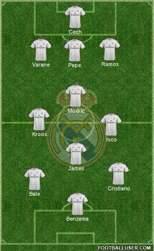 DeGea/Cech/KeylorNavas · Varane/Pepe · Ramos/Nacho · Marcelo/Alaba · Danilo/Carvajal · Modric · James/Isco/Reus · Kroos · Cristiano · Bale · Falcao/Benzema