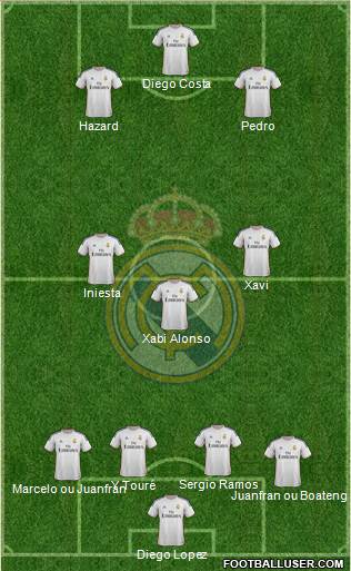 Diego Lopez · Juanfran ou Boateng · Marcelo ou Juanfran · Y.Touré · Sergio Ramos · Xabi Alonso · Iniesta · Xavi · Hazard · Pedro · Diego Costa