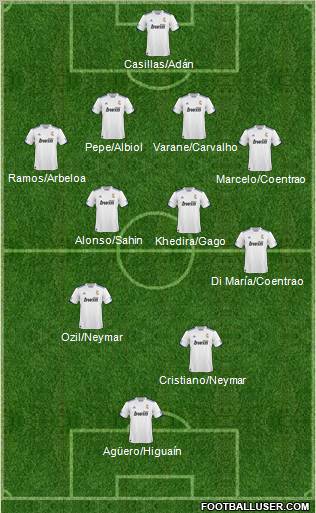 Casillas/Adán · Pepe/Albiol · Varane/Carvalho · Ramos/Arbeloa · Marcelo/Coentrao · Alonso/Sahin · Khedira/Gago · Di María/Coentrao · Ozil/Neymar · Cristiano/Neymar · Agüero/Higuaín