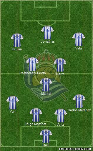 Rulli · A.Elustondo/Íñigo · Mikel · Héctor · Zaldúa · D.Reyes/X.Prieto · R.Pardo · Illarramendi · Oyarzábal · Vela · Jonathas